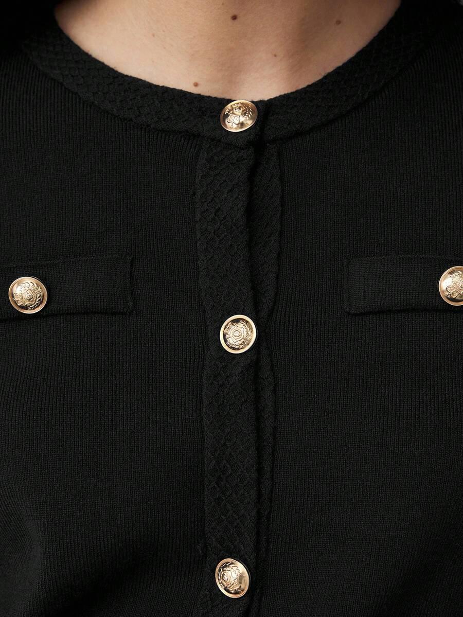 Conception: Un cardigan noir intemporel en maille, doté d'une patte de boutonnage épurée. Son motif uni et son encolure ronde offrent un luxe discret et une esthétique minimaliste. Son ourlet régulier et ses manches longues créent une silhouette équilibrée, idéale à superposer sur une tenue de bureau. Non doublé pour une polyvalence et une chaleur légère, il incarne l'élégance intemporelle et le style classique pour des tenues chics en milieu professionnel.