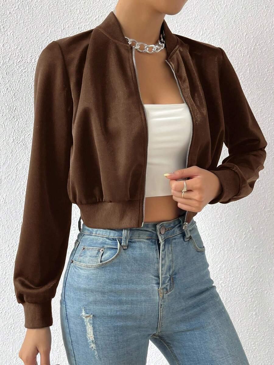 Élégance intemporelle et luxe tranquille Ce bomber court zippé et solide est parfait. D'un noir classique, il présente une silhouette épurée et minimaliste avec un col de baseball et une élégante fermeture éclair sur le devant. longueur de la récolte se marie parfaitement avec des pièces taille haute pour une esthétique raffinée et de style old money en accord avec mode minimaliste. Le corps est non doublé, gardant un look léger et polyvalent, tandis que l'ourlet serré préserve une forme raffinée et épurée.
